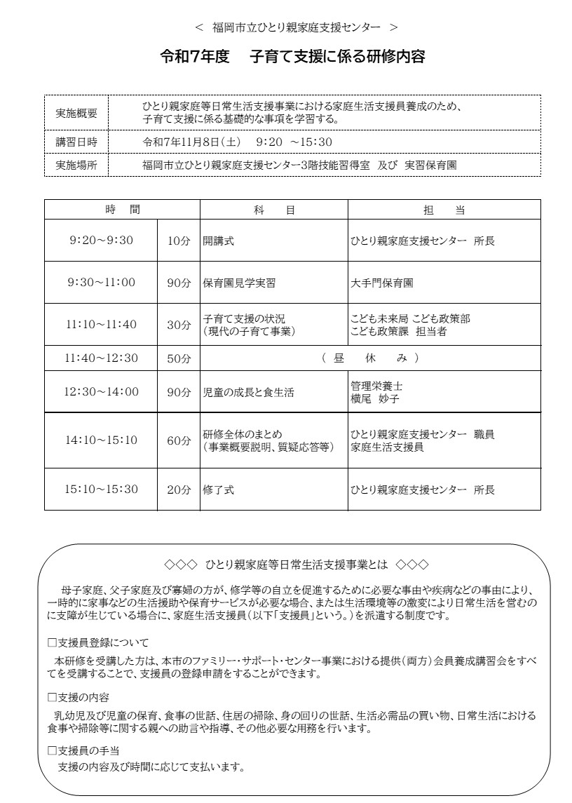 | 問合わせ・申込み先 | 福岡市立ひとり親家庭支援センター(電話:092-715-8805) |